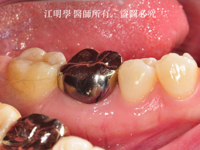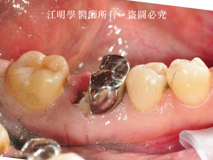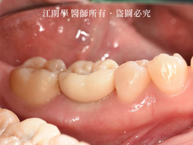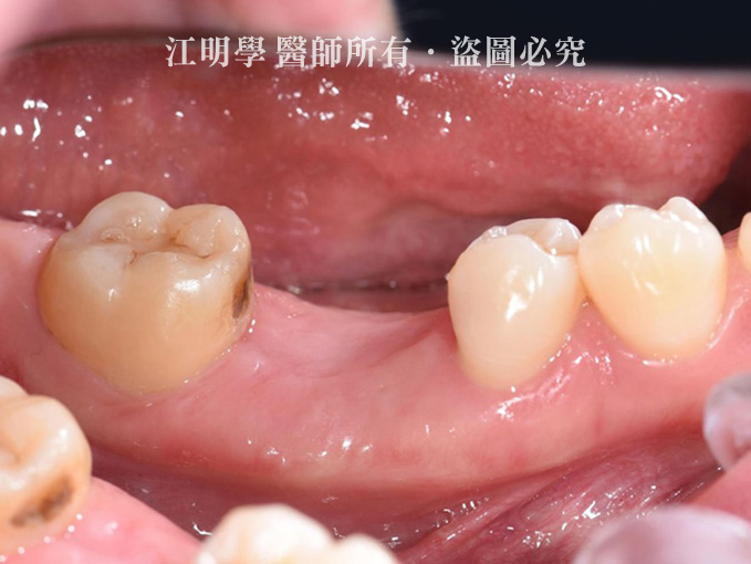 張小姐的右下第一大臼齒在年輕時就因為嚴重蛀牙,接受抽神經及牙套,但這樣的牙齒最終還是在40幾歲報銷,從X光片來看為深層蛀牙,只能做最終的處置:拔牙。