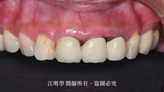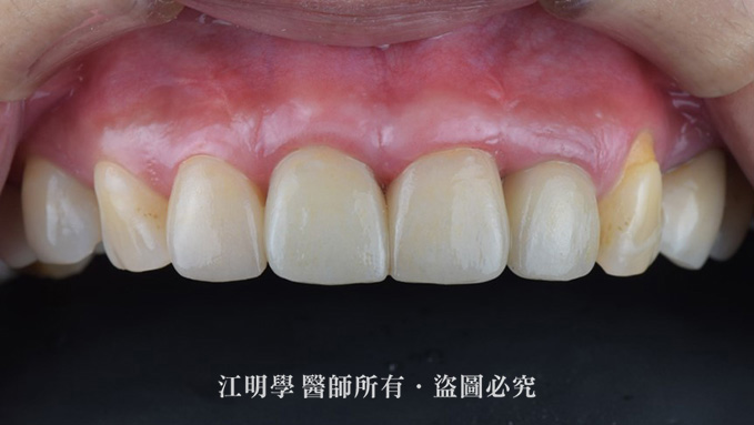 治療後:金屬假牙已更換為全瓷冠,牙冠增長後整體比例更佳。
