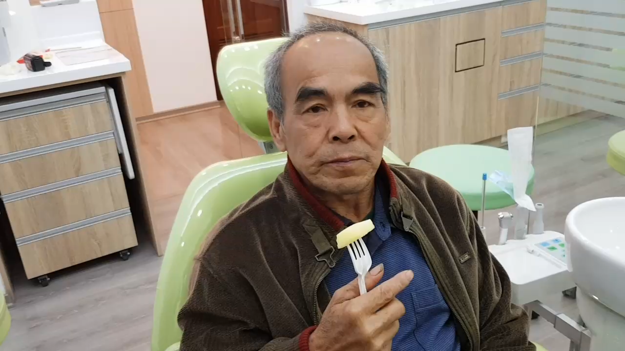 陳先生完成BPS假牙治療之後,在診所內實測馬上吃蘋果,結果完全沒問題!