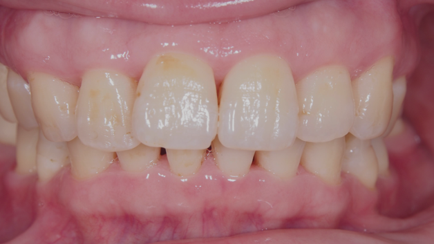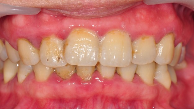 病患因牙周病問題,時常在刷牙的時候都會發現牙齦有流血、牙齒歪斜傾倒,導致刷不乾淨的問題,前來求診。