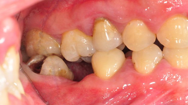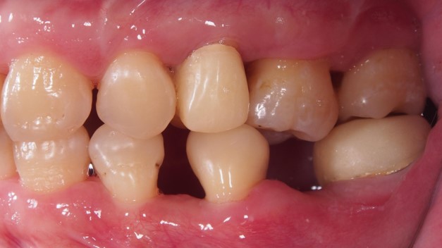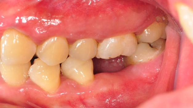 牙周治療前:口內衛生不佳、牙齦紅腫、後牙缺牙、牙齒傾倒等問題。