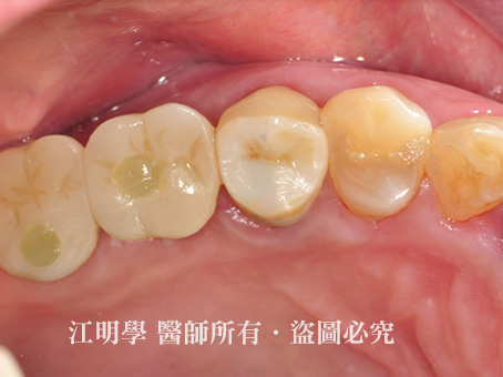 後牙原本就有缺牙、大臼齒蛀牙嚴重,需要拔除,後牙小臼齒還沒有傷及牙根,做抽神經再套上牙套即可。