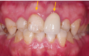 - 前牙原錯咬,上排牙齦高低不一,做〖 牙冠增長術 〗 修飾牙齒形狀。