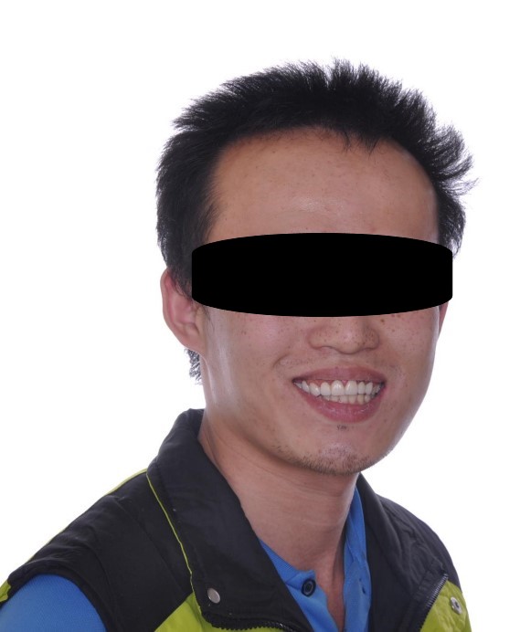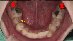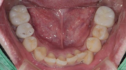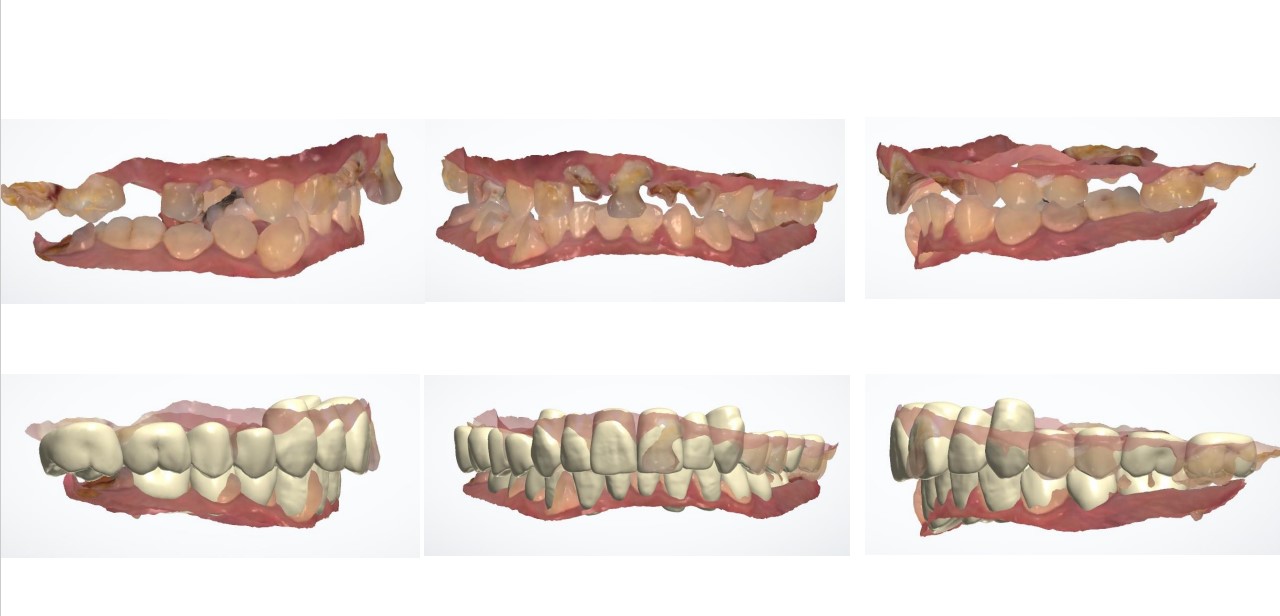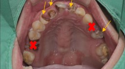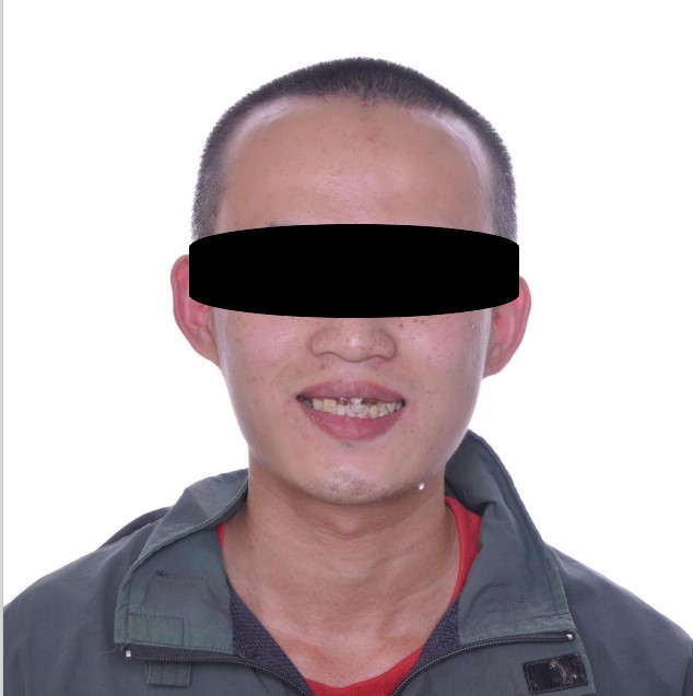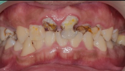 治療前:前牙蛀洞大,牙齦發炎,殘根,小臼齒蛀牙深,牙齒變色。