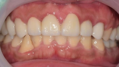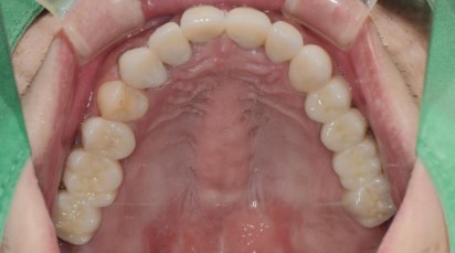 治療後 :套上假牙套+無牙根缺牙處靠牙橋復型,洗牙減緩牙齦發炎