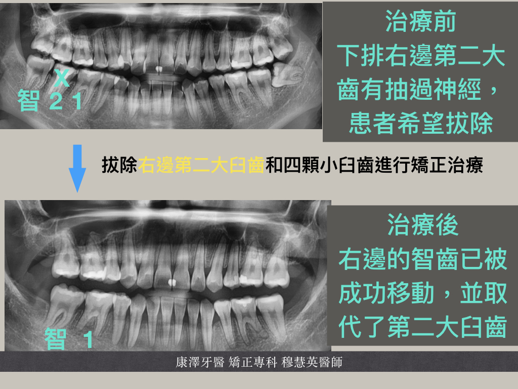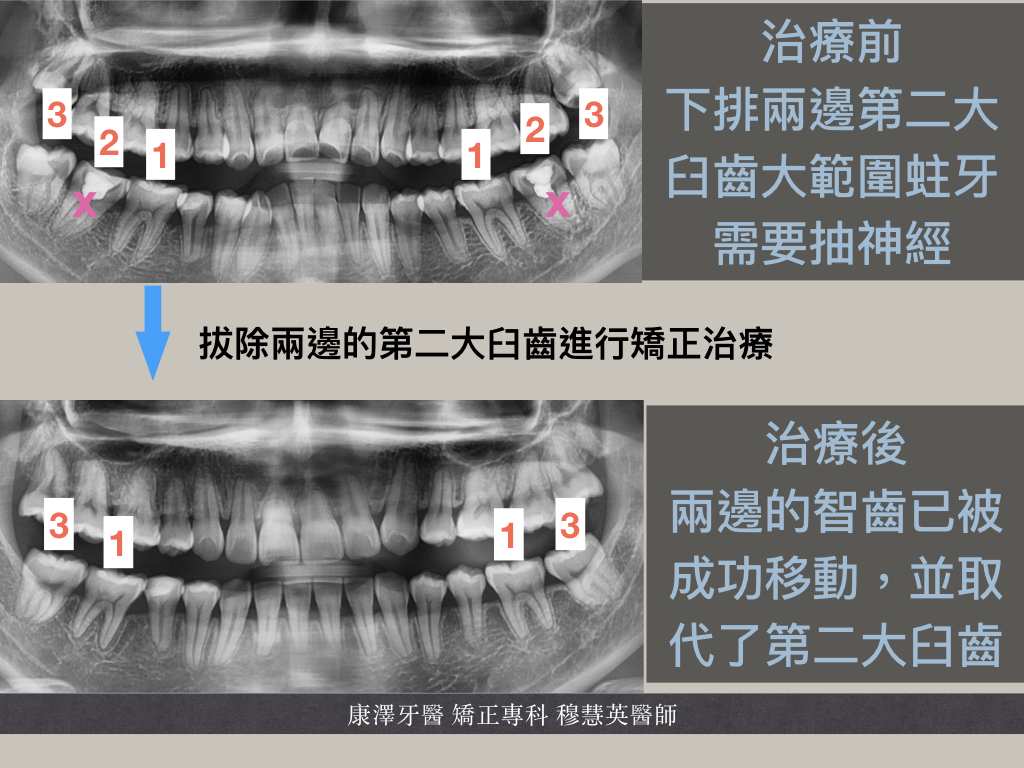 在齒顎矯正治療中,一個精心設計的治療計劃可以帶來很多好處,例如拔除大範圍蛀牙或難以修復的下顎第二大臼齒,並利用一般認為無用的智齒來替代,從而達到理想的治療效果。在一些病例中,患者可能因為嚴重的蛀牙或其他原因需要拔除下顎的第一或第二大臼齒,而智齒的位置和發育狀況良好,可以在矯正過程中被移動到缺失牙齒的位置。這不僅能夠解決原有的牙齒問題,還能充分利用智齒,所以好的智齒是很有用的(智齒表示驕傲)。
