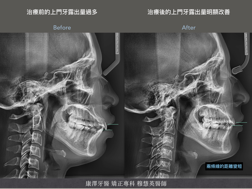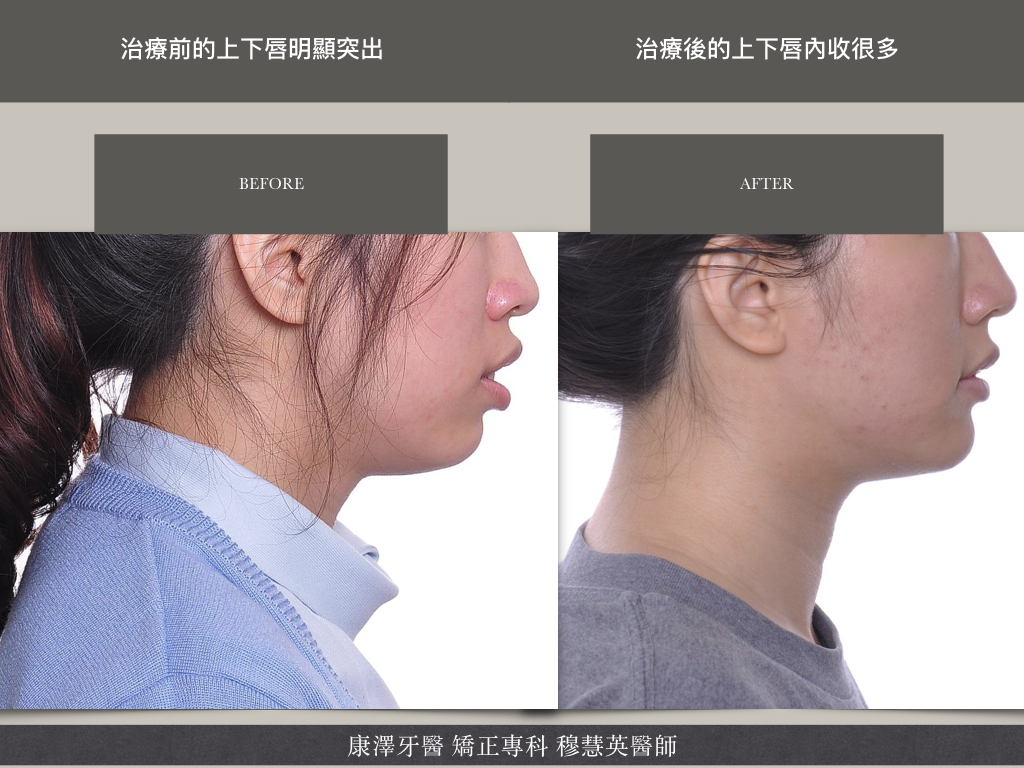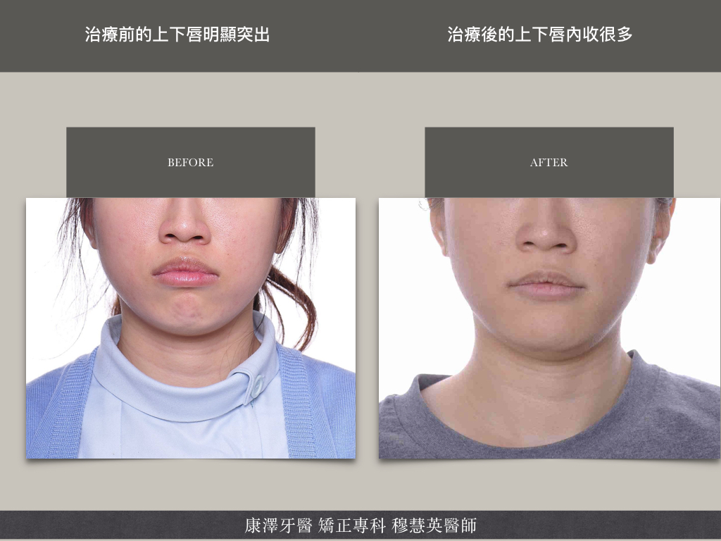 - 暴牙改善:原本突出的前牙已經變得平整而自然,整體的顏面外觀更加和諧。