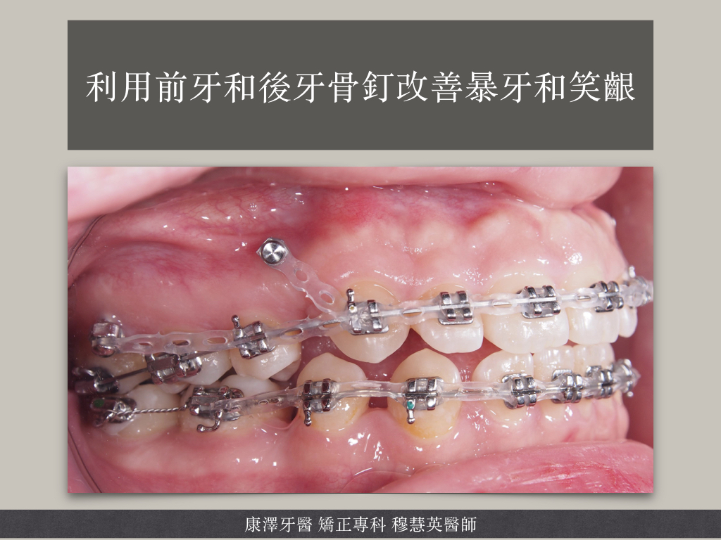 上顎後牙和前牙區骨釘的使用:為了解決笑齦問題,我們在陳小姐的前牙區植入骨釘。這些骨釘提供了額外的錨定,有效地減少牙齦的暴露,後牙區的骨釘則幫助我們達到理想的前牙內收量,有效改善了暴牙的問題。