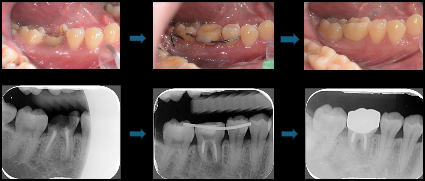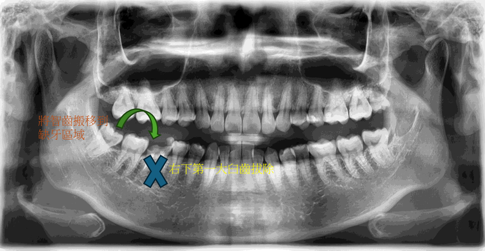 術前評估口腔狀況 右下第一大臼齒斷裂 治療計畫 右下第一大臼齒拔除, 將右下智齒移植到缺牙區域 拔除右下第一大臼齒 拔除智齒,固定至第一大臼齒缺牙區域 智齒固定 術後完成假牙裝戴 牙齒狀況改善 術前 術後 術前 術後 治療演進 分享到