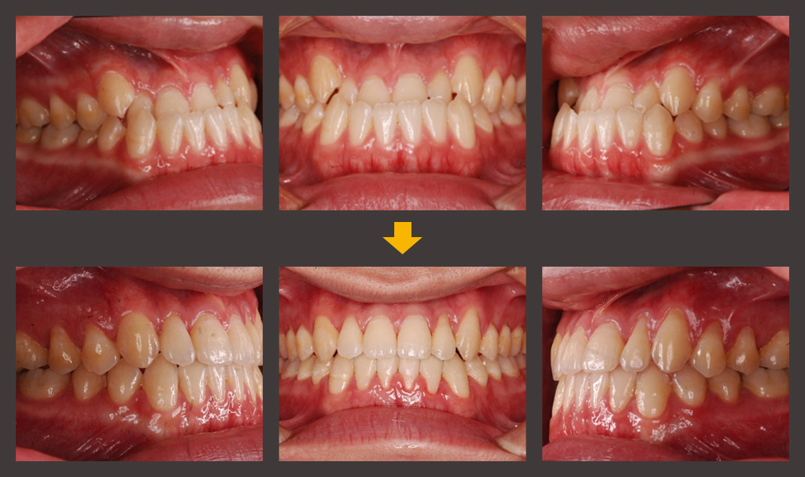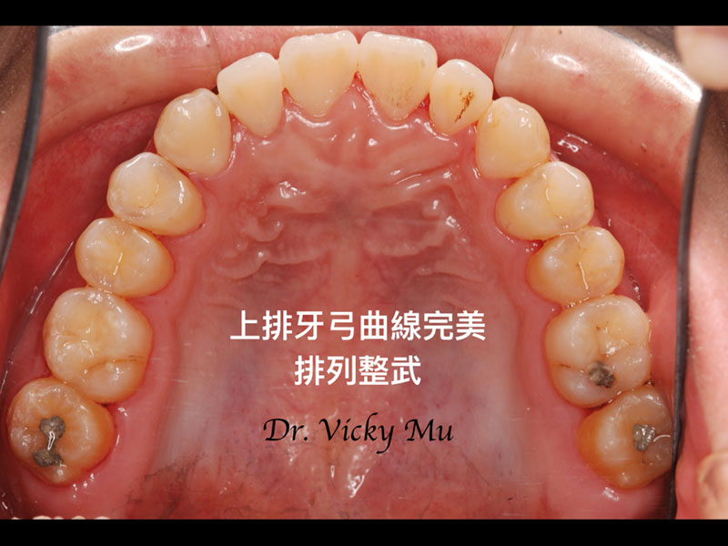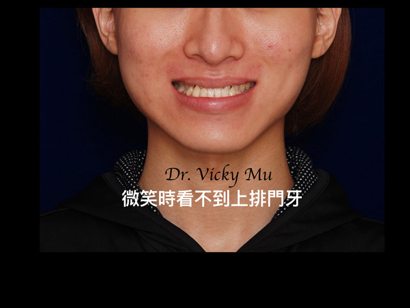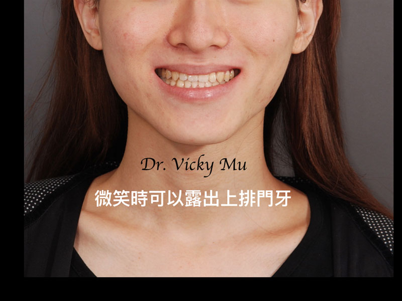 矯正前微笑時無法露出上排門牙,讓客戶覺得很沒有自信。矯正過程中將下排門牙內收以及將上排門牙排齊並向下拉出後就可以還客戶一個迷人的笑容囉~