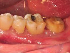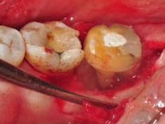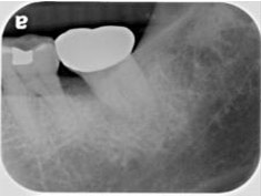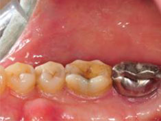 E圖為牙齦翻瓣清創後之舌側觀,其近心側繞舌側有一寬且深,深達5毫米,型態為合併雙壁、三壁之骨內缺損(combined two-three walls intrabony defect),舌側之根叉侵犯為1毫米。
