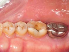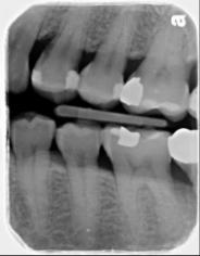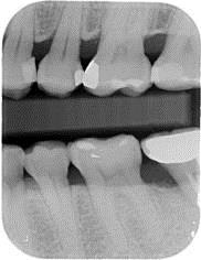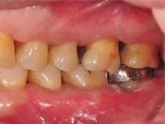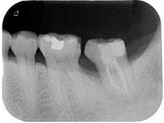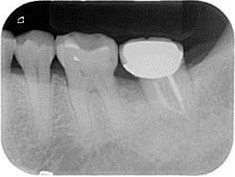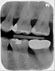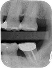 術後一年之全口X光片, #37近心側可見明顯骨充填與放射線密度增加。 牙周再生手術完成一年後追蹤,全口牙齦發炎狀況改善,牙周組織呈現健康狀況。#37金屬燒附陶瓷牙冠製作完成。