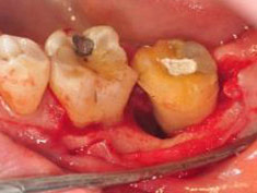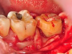 D圖為牙齦翻瓣清創後之頰側觀,#37其近心側有一寬且深,深達9毫米,型態為三壁之骨內缺損(three walls intrabony defect),頰側之根叉並無侵犯。