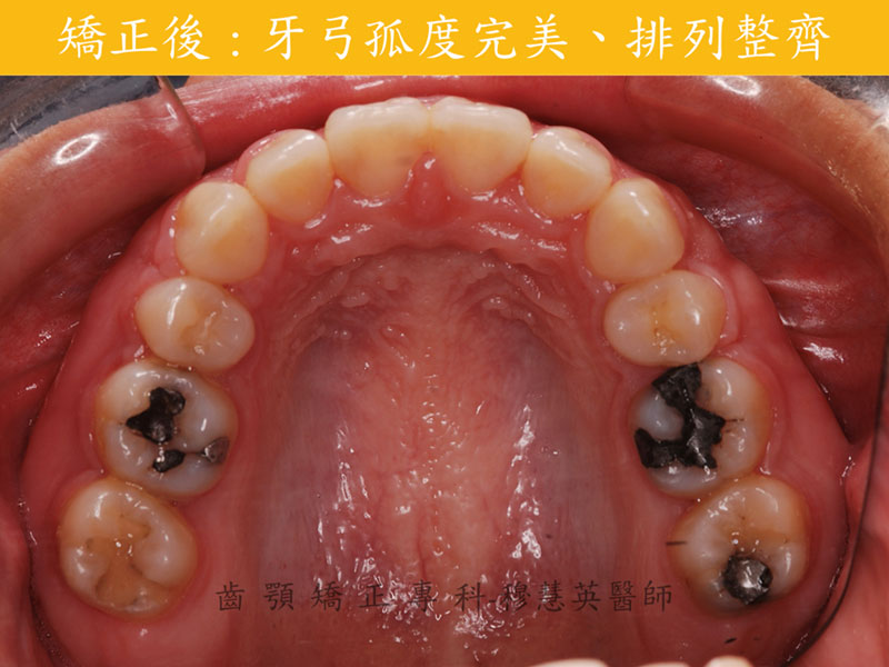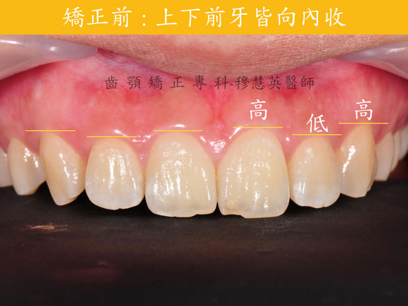 此案例,在矯正結束後,牙齦高度不甚理想,可經由牙周組織的微整型使得正中門牙、側門牙、犬齒的牙齦高度達到高、低、高的理想位置。