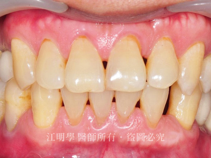 經評估後,首先拔除不可用的牙齒,透過軟組織再生手術改正植牙周圍牙齦型態與厚度,並利用再生膜幫助骨頭生長,恢復牙周的健康。