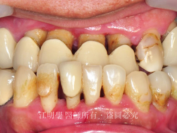 拆除既有固定式假牙,並考量牙齒長久使用性,為江先生進行根管治療與假牙膺復,以完整恢復牙齒的健康與功能。