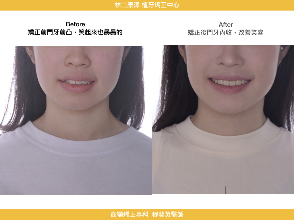 這是一個改善外觀的經典矯正案例,在康澤牙醫由矯正專科穆慧英醫師治療下,透過拔牙空間內收前牙,不只處理了牙齒排列,更徹底解決了唇形與臉型比例的長期困擾。成年女性在意的,不只是矯正後的牙齒整齊,而是從正面到側面,每一個角度都能展現自信與自然美感。
